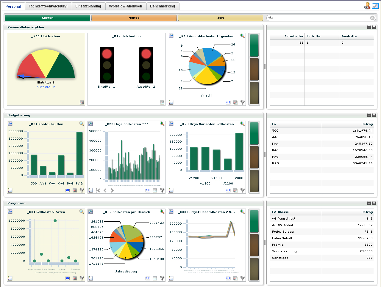 Beispiel: der P&I HR-Leitstand. Er gibt dem Personalmanagement ein Controlling-Instrument an die Hand und stellt strategische Daten übersichtlich zur Verfügung. Gerade für Führungskräfte ist es wichtig zu wissen, wie sich bestimmte Personalkennzahlen entwickeln. Dies können beispielsweise die Fluktuation innerhalb des Unternehmens oder einzelner Bereiche oder auch die Fremdsprachenkenntnisse in bestimmten Abteilungen sein. Über den HR-Leitstand lassen sich entsprechende Szenarien, beispielsweise bei der Personalentwicklung, grafisch aufzeigen und aus unterschiedlichen Blickwinkeln beleuchten. Auf einen Blick ist dadurch erkennbar, wie sich personelle Maßnahmen auswirken – und direkt aus dem HR-Leitstand heraus können geeignete Maßnahmen wie z.B. die Anmeldung für einen Fremdsprachenkurs oder die Schaltung einer Stellenanzeige initiiert werden. Der HR-Leitstand stellt eine Unterstützung bei Managemententscheidungen dar.