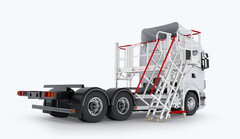 BU: Steigtechnik für sichere Wartung am Nutzfahrzeug: HYMER präsentiert seine neue Multi-Arbeitsbühne. Sie eignet sich für alle Arbeiten in der Höhe, bei denen ein strebenfreier Unterbau und gleichzeitig eine flexible Höhenverstellung erforderlich sind.