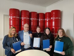 BU: Übereinkunft vor den bekannten roten Fässern: (von links nach rechts) Petra Schmid (Fachschaftsleitung Wirtschaft/WG, Kaufmännische Schule Göppingen), Andreas Schweikardt (Schulleiter, Kaufmännische Schule Göppingen), Lara Schmelzle (Personalreferentin, Zeller+Gmelin), Sina Beutel (Teamleitung Personalmanagement, Zeller+Gmelin) und Karin Barthel (IHK-Referatsleiterin und Ausbildungsberaterin).